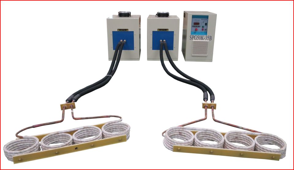 (2) Picture below shows SPG50K-35B-2 machine with two transformers working together. In this application, eight parts are heating together, but eight parts and coils are separated from each other a long distance. Now the cable between generator and each transformer is 2 meters long with 1 meter cable from transformer to coil.