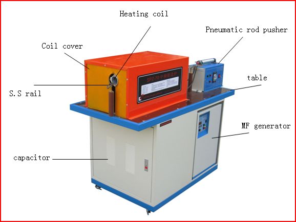 The furnace includes basically the SPZ medium frequency generator, the compensating cap, the working table, the heating coil, coil cover, rod feeder and so on. For some applications, the infrared sensor, temperature controller and automatic rod feeding systems can also be included.