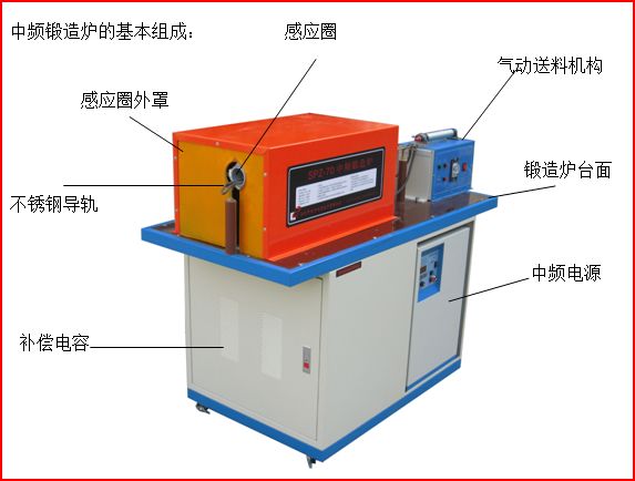 包括中频电源、补偿电容箱及工作台、感应圈、送料机构等。根据不同的应用要求,还可能包括红外测温仪,控温仪及送料、卷料等装置;